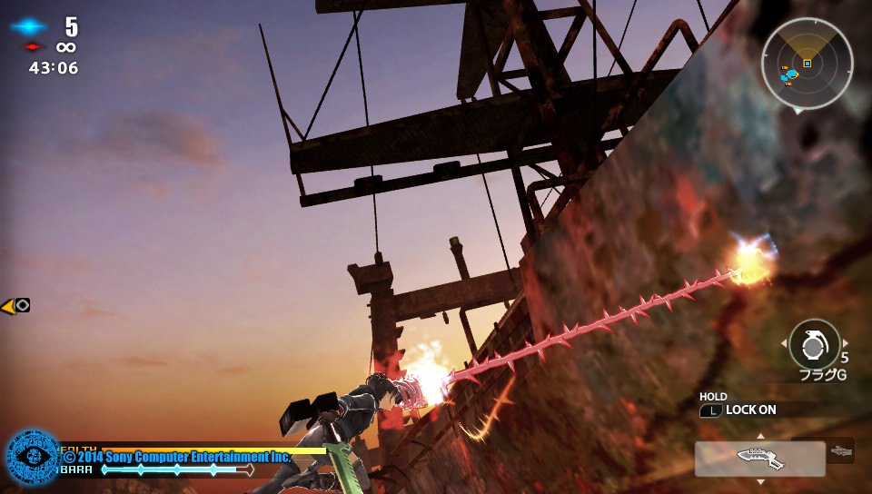 他にもビルの壁に打ち込んで一気に屋上まで登ってみたり、大型の敵の足に打ち込んで引きずり倒したり、色々な使い方ができます。