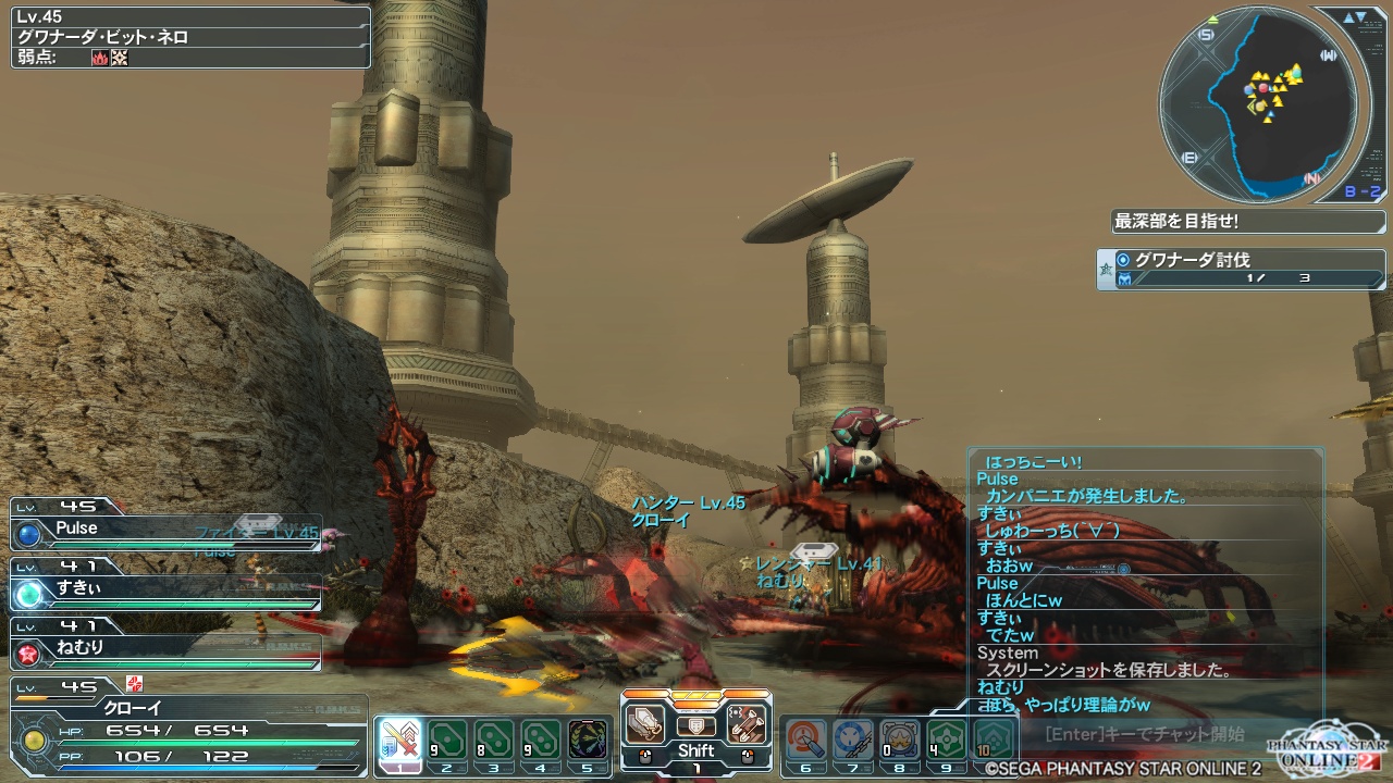 この前のアップデートで、レアボスに出会える確率が10倍になったそうです。そこで、前々から行こう、って言ってたレアグワ退治へ。アズが狙ってる闇テクのサ・メギド探しです。