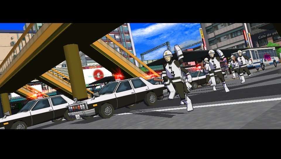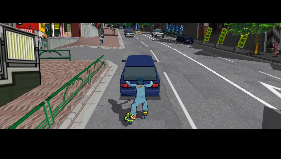 彼らの武器は、超高性能なインラインスケート。上のスクリーンショットみたいにクルマに張り付いたりもできるし、ガードレールや歩道橋の手すりなんかをグラインドできたり、看板をマトリックス的に伝って遠くまでジャンプしたり。